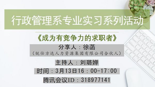 3月13日下午,3044am永利集团3044noc线上实习系列讲座之三:成为有竞争力的求职者,通过腾讯会议平台成功举行。本次活动邀请了锐仕方达人力资源集团有限公司合伙人徐菡女士,其讲座主题为“成为有竞争力的求职者”。本场报告由行政管理系刘璐婵老师主持。